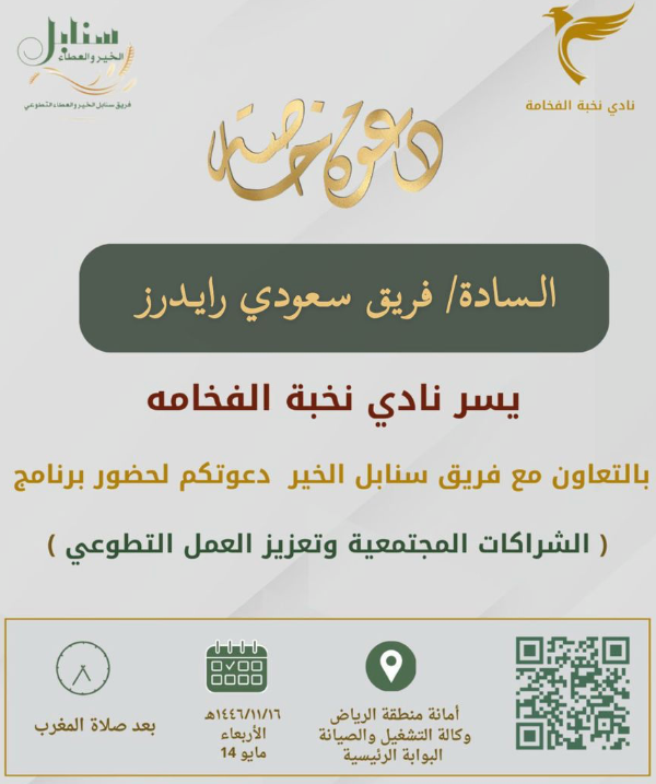 دعوة من نادي نخبة الفخامة بالتعاون مع فريق سنابل الخير دعوة فريق سعودي رايدرز لحضور برنامج ( الشراكات المجتمعية وتعزيز العمل التطوعي)